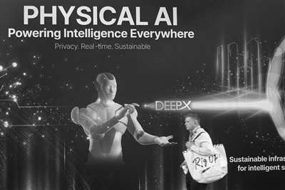 一名男子在2026年美国拉斯维加斯消费电子展上走过印有“物理AI”字样的展台。 (资料照片)