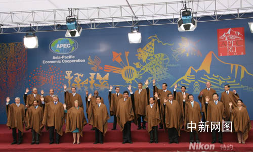 为期两天的亚太经合组织第十六次领导人非正式会议,二十三日在秘鲁首都利马结束。图为各成员领导人在会后身着南美披风合影。齐彬摄图片来源:中国新闻网